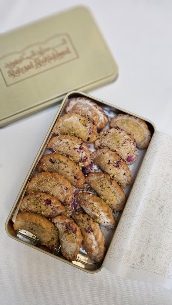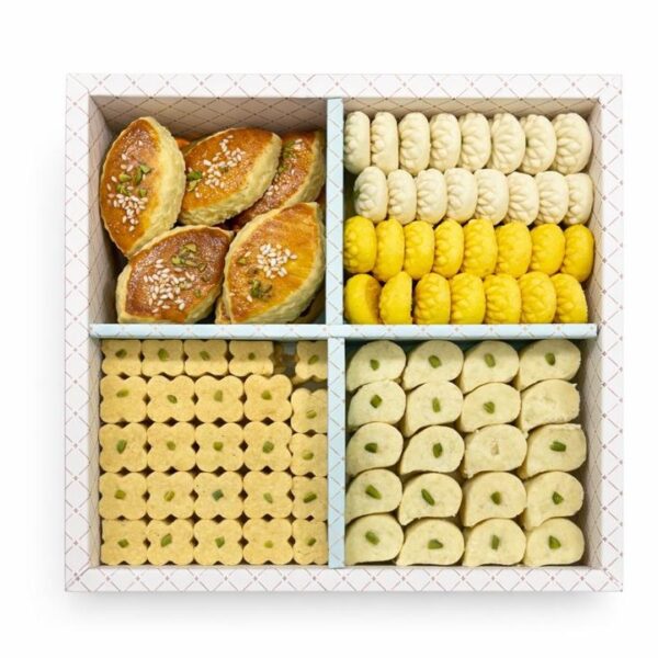 جعبه ۷۰۰ تا ۷۵۰ گرمی شامل کوکی لیمو و بهارنارنج،کوکی نانتز(پودر بادام و رومال قهوه)،کوکی شکلات تلخ و فندق،کوکی پسته و کرنبری.