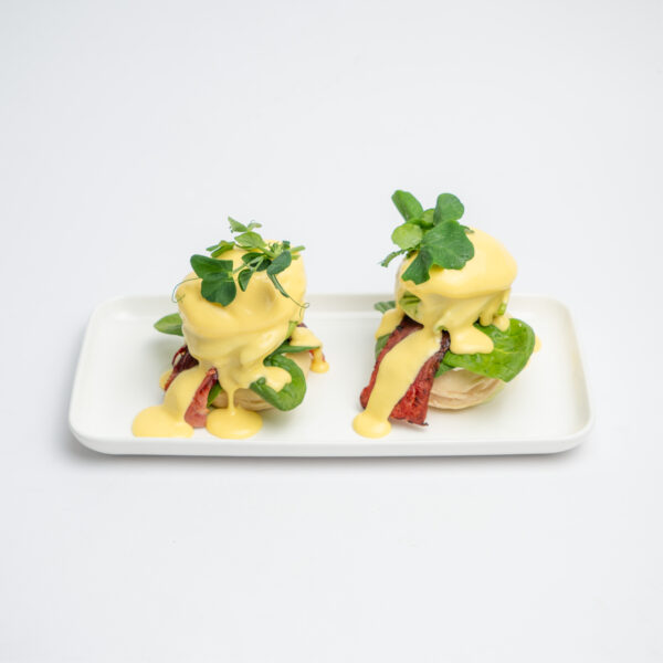 نان مافین خانگی، همراه با تخممرغ پُوچد، بیکن گوساله، دیپ پیازچه، سس هولندایز و بیبی اسفناج