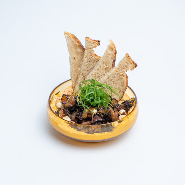 نان خمیرترش خانگی همراه با بادمجان کبابی، پنیر خامهای، سس فلفل دلمهای قرمز دودی، چیپس بادمجان و فندق