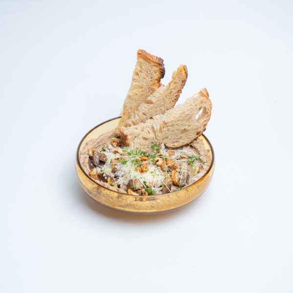 نان خمیرترش خانگی همراه با ترکیب قارچ دکمهای و گردو، پنیر خامهای، قارچ تفتدادهشده در کره و آویشن