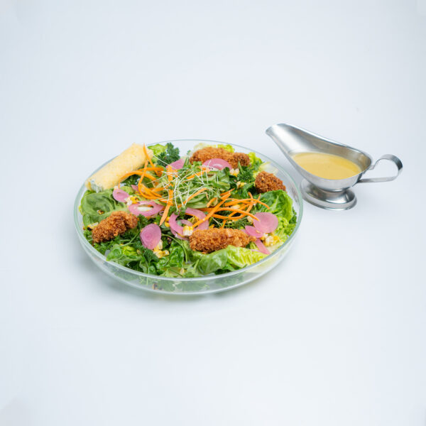 کاهوی لیتلجِم و جعفری همراه با رشتههای خیار و هویج، پیکل پیاز قرمز، مرغ بادامی و سس سرکه و عسل