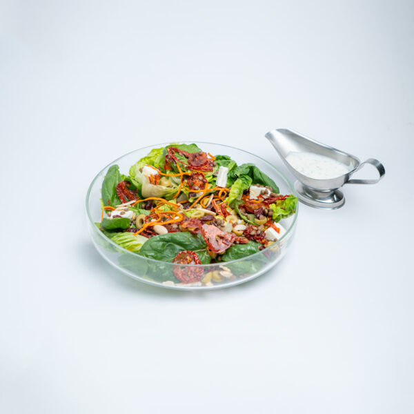 کاهوی لیتلجِم و بیبی اسفناج همراه با رشتههای هویج، گوجه خشک، عدس، پرک بادام، پنیر فتا و سس ماست و شوید
