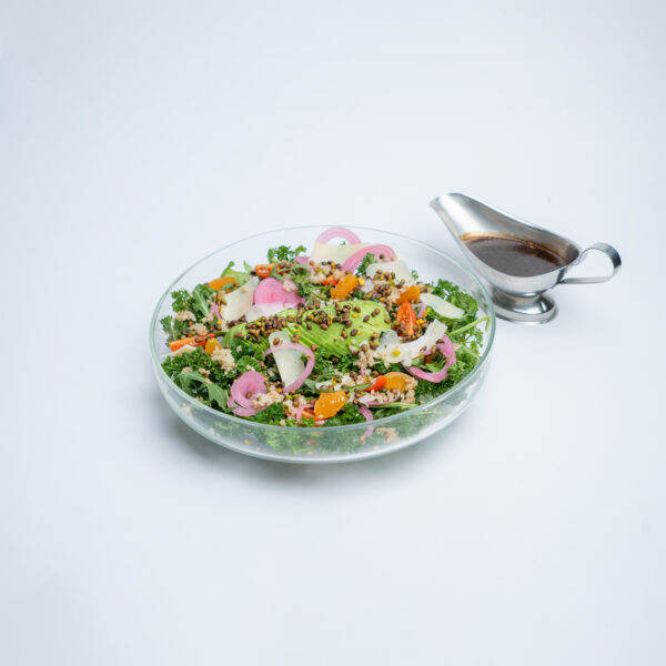 روکولا و جعفری ،کینوا، گوجه گیلاسی همراه با پنیر پارمسان رندهشده، پرک بادام و سس خردل و عسل