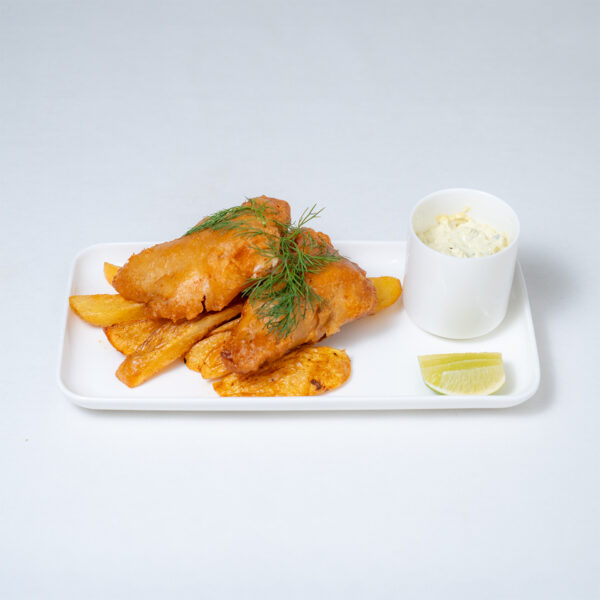 ماهی کفشک سوخاری با سس تارتار دستساز و ساید فرایز