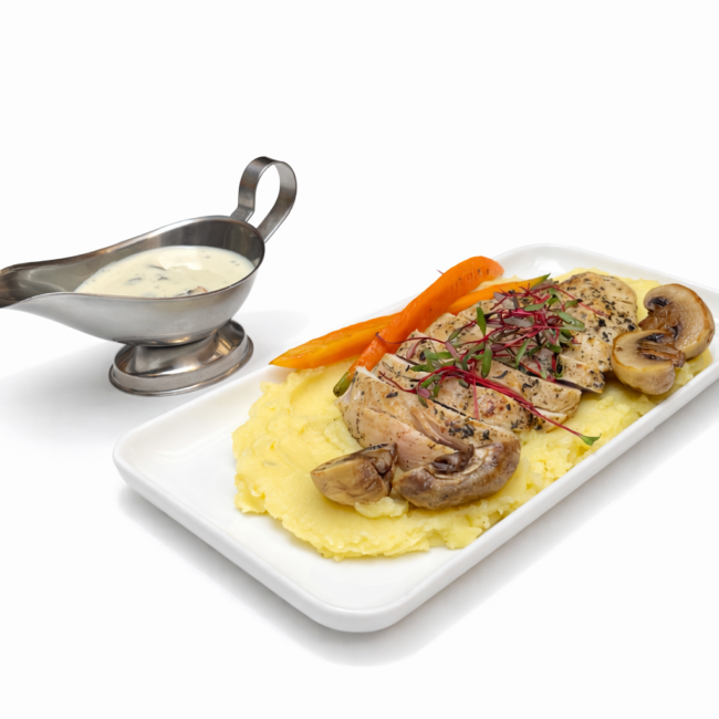 سینه مرغ، پوره سیبزمینی، قارچ و هویج همراه سس بشامل و قارچ.